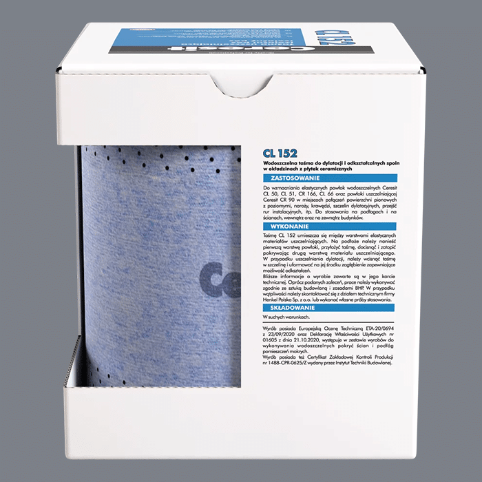 CERESIT® CL 152 je zaptivna, vodootporna traka pogodna za dilatacijske i deformirane spojeve između keramičkih pločica. CL 152 se preporučuje za upotrebu u zatvorenom i na otvorenom u vlažnim prostorima. Otporna je na napetost i hemikalije, jednostavna za upotrebu i super fleksibilna. Koristi se za primjenu u kuhinjama, balkonima i terasama.