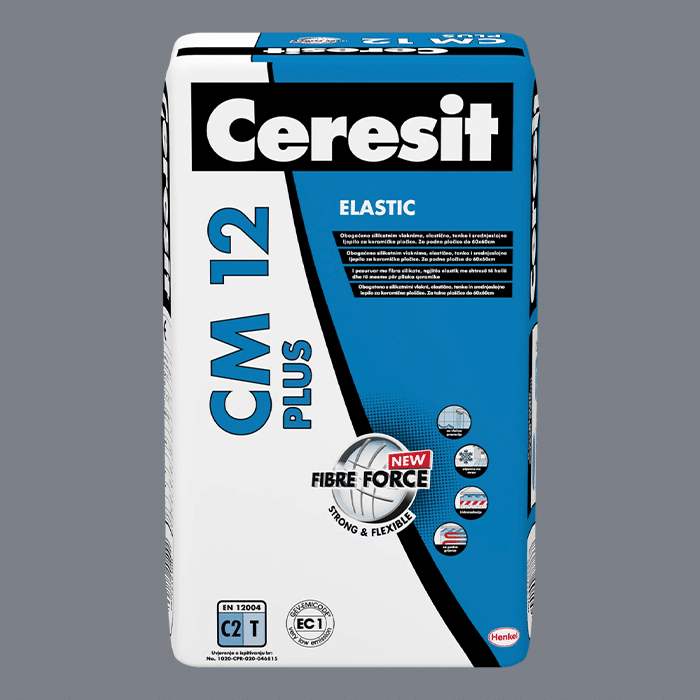 CERESIT® CM 12 PLUS je fleksibilno ljepilo za pločice namijenjeno za polaganje porculanskih pločica i ostalih keramičkih, cementnih i pločica od prirodnog kamena (colorfast) u unutarnjim i vanjskim prostorima. Ljepilo CM 12 PLUS može se koristiti u vlažnim prostorijama i u prostorijama s podnim grijanjem. Ljepilo za pločice CM 12 PLUS nanosi se na ravne, nosive i kompaktne podloge, bez ikakvih tvari koje smanjuju prionjivost (masnoća, bitumen, prašina).