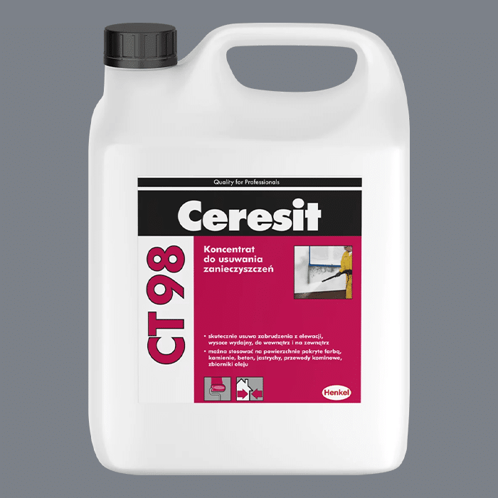 CERESIT® CT 98 omogućava pranje i odmašćivanje jako zaprljanih fasada zgrada izgrađenih ETICS sistemom, tretiranih tankim slojevima mineralnih, akrilnih, silikatnih, silikonskih i silikat-silikonskih završnih slojeva. U tradicionalnim tehnologijama, cementni i krečni završni slojevi i fasade koje su izrađene od prirodnog i umjetnog kamena ili obrađeni keramičkim oblogama i fasadama od stakla i aluminija. Može se koristiti i za čišćenje i odmašćivanje minerala tla koja su kontaminirana prije nanošenja uzastopnih slojeva tla. Pakovanje: plastični kanister od 5 l.