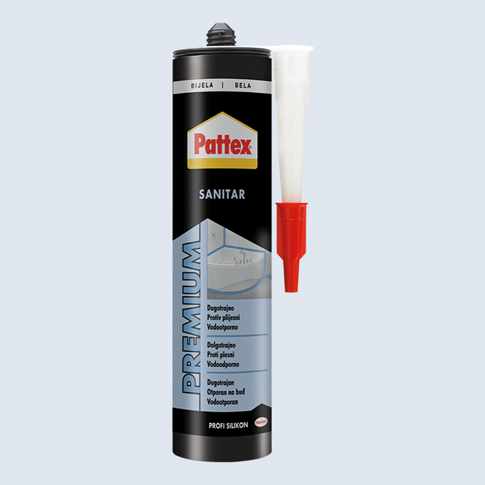PATTEX Sanitarni silikon je jednokomponentni silikon za zaptivanje spojeva i pukotina u vlažnim prostorima poput kupatila, toaleta i kuhinja. Sadrži fungicidne supstance koje sprječavaju zadržavanje vode i razvoj buđi. Silikon je vodootporan, otporan na UV zračenje i pruža odličnu adheziju na različite površine. Nanosi se pištoljem, a spojevi se zaglađuju špatulom natopljenom sapunjavom vodom. Neosušeni silikon se lako uklanja rastvaračem, dok se osušeni može ukloniti samo mehanički.