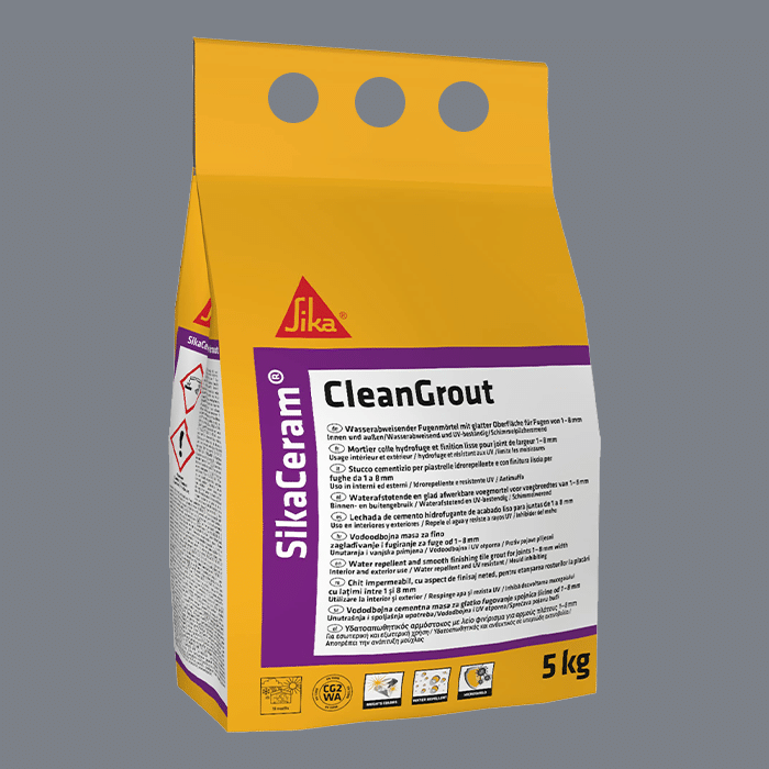 SikaCeram® CleanGrout je cementna podesiva podna/zidna masa za fugiranje fuga širine 1- 8 mm, a uz to je i inhibitor plijesni. Aditivi sadržani u masi osiguravaju prevenciju i zaštitu od rasta plijesni, bakterija i gljivica pri čemu održavaju stabilnost boje, otpornost na abraziju i vodoodbojnost. Za unutarnju i vanjsku primjenu. EN 13888: CG2WA.
